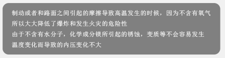 1.制动时,车辆零件、轮胎与路面因摩擦会产生高温,不带有氧气充填减少燃烧的风险因素。