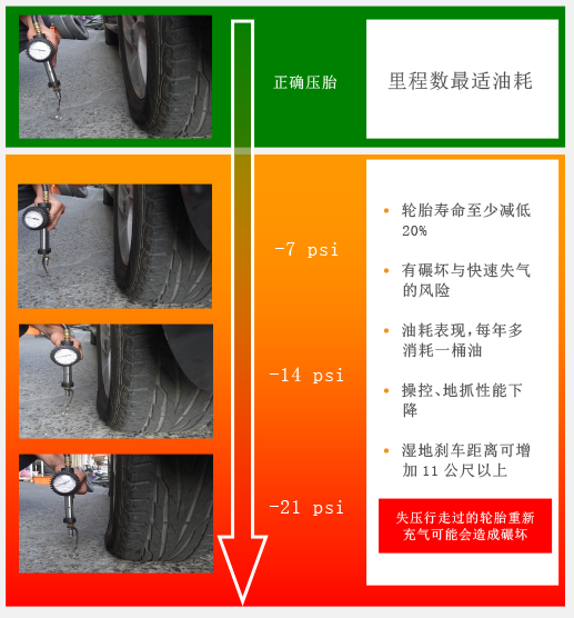 正确的轮胎气压,可以节省燃油消耗,从而减少二氧化碳排放,同时减少事故发生率,确保安全。