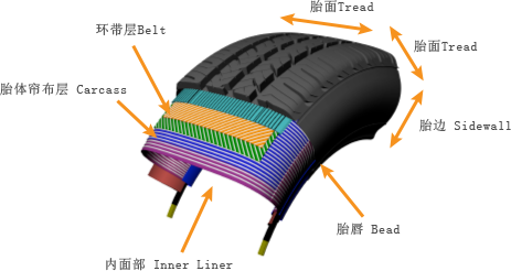 它是轮胎的骨架,用来承受轮胎的荷重压力、内部的胎压及横向的剪应力等。它由多层的帘布(人造纤维+胶料)或钢丝组合而成。